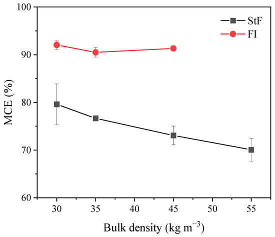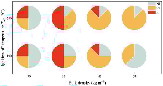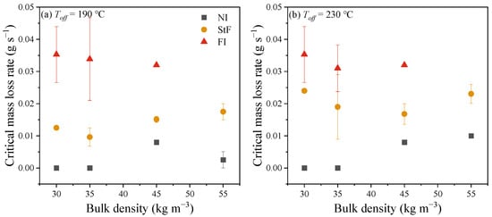 - The critical MLR for StF transition ranged from 0.01 g s−1 to 0.03 g s−1, which increased with the increase in heat supply. The MCE for FI is approximately 90% across all the bulk densities, while for StF transition, it ranged from 70% to 80% and decreased with the increase in the bulk density of fuel bed.