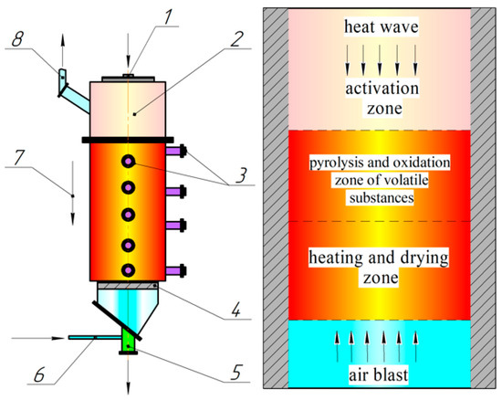 Scheme of experimental gasifier operation (1—hatch for fuel loading; 2—reactor; 3—thermocouples; 4—grate; 5—nozzle for semi-coke unloading; 6—oxidant supply; 7—direction of heat wave inside the reactor; 8—nozzle for generator gas outlet).