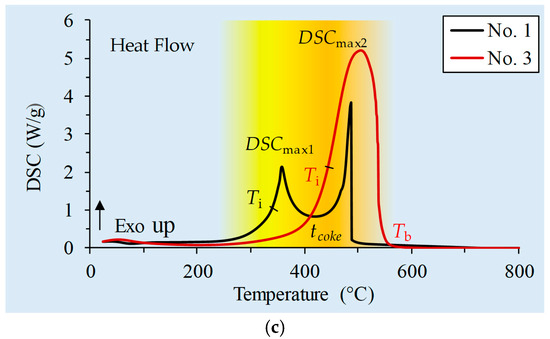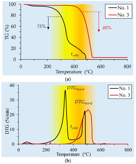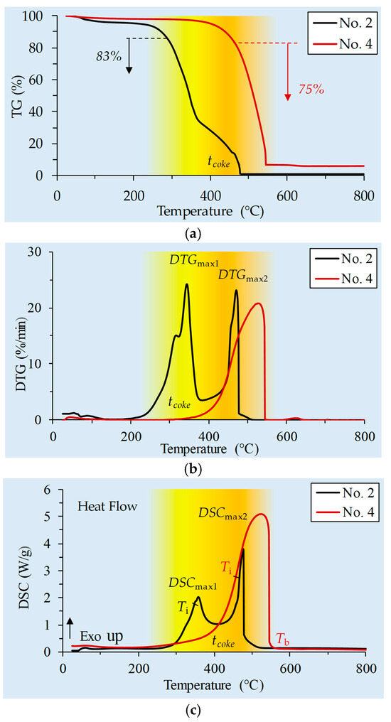 When heating fuel No. 3, the maximum mass loss rate is reached in the range of higher temperatures (TDTG2 = 509 °C) due to the absence of volatile combustion and was 23.3%/min, while the maximum heat flux intensity was 5.2 W/g due to the high heat of combustion (Table 1). The temperature at which the combustion of fuel No. 3 is completed is 552 °C (Table 2), and the total combustion time of the coke residue was 5.6 min (Figure 2b,c).