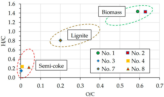 The atomic H/C and O/C ratios of fuels No. 1–4 presented in Figure 3 were calculated using the results of the elemental analysis presented in Table 1 and for fuels No. 7 and 8, the elemental composition values were taken from our previously published works [42,43]. The high heat value of lignite was 29.3 MJ/kg, and that of the semi-coke obtained from it was 33.2 MJ/kg. Analysing Figure 3, a significant decrease in the atomic ratios H/C and O/C of the obtained semi-coke biomass and coal is observed due to the increase in their carbon content and decrease in oxygen, which indicates an improvement in their combustion characteristics and an increase in the heat of combustion. Similar conclusions were made by other authors [44]. In our case, the combustion time of coke residue decreased almost twofold, although the combustion index of semi-coke became lower than that of the original biomass.