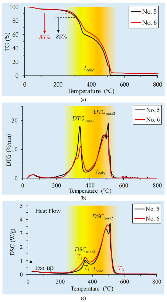 The dynamics of mass loss during combustion of the coke residue of the mixtures is almost identical to each other, with No. 5 having a mass loss rate of 85% and No. 6 at 86% (Figure 5a). The temperature at which the combustion of the coke residue of the mixtures takes place corresponds to the wood in the initial state (Table 2), and the temperature at which the combustion process is completed is slightly lower compared to semi-coke (Table 2). The combustion process of the coke residue of the mixtures is represented by DTG and DSC curve profiles in the form of two maxima; in the first maximum, part of the volatile substances and part of the coke residue burns; the second maximum corresponds to the combustion of the coke residue of wood and semi-coke. The maximum mass loss rate in the temperature range of 200–380 °C, corresponding to the combustion of part of the volatile substances and part of the coke residue in mixture No. 5, reached 18.1%/min at a temperature of 340 °C, accompanied by a small exothermic effect with a maximum heat flux intensity of 1.1 W/g at a temperature of 345 °C. For mixture No. 6, the maximum mass loss rate in the same temperature range reached 11.1%/min at 344 °C and a maximum heat flux intensity of 1.3 W/g at 347 °C. At further heating of the mixtures, combustion of the main part of the coke residue occurs in the temperature range of 380–530 °C. The maximum loss rate of mixture No. 5 reached 19.1%/min at a temperature of 509 °C, accompanied by an exothermic effect with a maximum heat flux intensity of 3.7 W/g; in mixture No. 6, the maximum mass loss rate in the same temperature range reached 15.2%/min at a temperature of 494 °C with a maximum heat flux intensity of 3.6 W/g at a temperature of 499 °C (Table 2). The total combustion times of No. 5 and No. 6 mixtures were 10.0 and 9.7 min, respectively. Due to the decrease in the maximum mass loss rate, the combustion index of mixture No. 5 increased to 2.5 min−2 °C−3; that of mixture No. 6 increased to 1.4 min−2 °C−3.