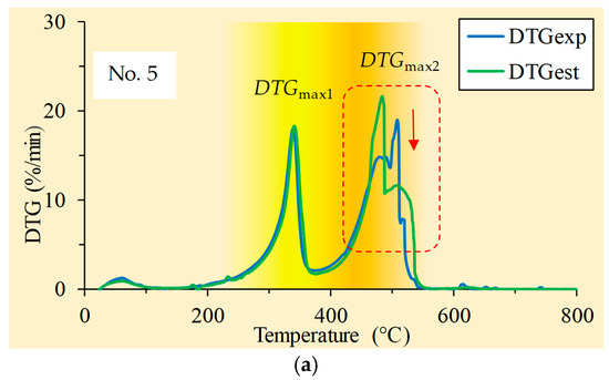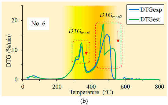 Comparison of DTG curve profiles of the investigated fuel mixtures obtained experimentally and as estimated: (a) mixture No. 5; (b) mixture No. 6.