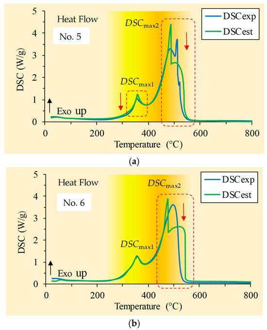 Figure 7 shows the comparison of calculated (DSKest) profiles of DSC curves and experimental (DSKexp) ones. During the heating of mixture No. 5 (Figure 7a), synergistic interactions between mixture components are observed in the temperature range of 320–380 °C, corresponding to volatile combustion, and in the temperature range of 450–540 °C, corresponding to coke residue combustion. During the experiment, the maximum intensity of heat flux DSCmax1 was lower by 9% than the calculated values of DSCmax1. In the temperature range corresponding to the combustion of semi-coke residue and biomass, a decrease was also observed in the maximum intensity of heat flux at synergetic interactions of components of the mixture; the experimental values of DSCmax2 were lower by 16% compared to DSCmax2 obtained by calculation.
