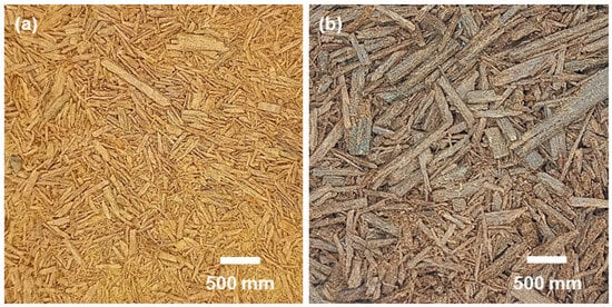 Photos of wood chips and powders after using a Willye Super-type knife mill, referring to (a) Goupia glabra Aubl. and (b) Manilkara huberi (Ducke) Standl.