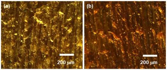The microscopic identification of the species Goupia glabra and Manilkara huberi was performed using optical micrographs at 100× magnification, as illustrated in Figure 2. The images show the transverse section of the specimens, revealing the key anatomical characteristics essential for distinguishing these species based on their wood structures. The species Goupia glabra displays a microscopic pattern characterized by the evident presence of axial parenchyma, arranged in short aliform paratracheal stretches. This type of parenchyma is considered an important anatomical marker, as it facilitates the transport and storage of nutrients within the wood tissue. Furthermore, thin and numerous radial cells are observed, irregularly distributed throughout the cellular matrix. The vascular structure of this species consists of solitary and multiple vessels, diffusely arranged, with medium to low abundance. Most of these vessels exhibit partial obstruction, suggesting the possible presence of phenomena such as tylosis formation or gum occlusion, features associated with the plant’s defense physiology against water loss or pathogen invasion. On the other hand, the species Manilkara huberi presents a distinct structural arrangement, with axial parenchyma visible to the naked eye, indicating a more robust organization of these cells within the wood tissue. At 100× magnification, thin and numerous radial cells can be seen, also irregularly distributed. The vascular system of M. huberi is composed of predominantly solitary and multiple vessels that are diffusely arranged but more abundant than in G. glabra, ranging from medium to high abundance. Many of these vessels exhibit partial obstruction, while others are fully occluded, suggesting a more advanced degree of obstruction, potentially related to the maturity of the specimens or internal physiological processes such as tissue senescence or response to environmental stresses. These microscopic observations are consistent with previously reported data in the literature, demonstrating the accuracy of species identification through comparison with the Brazilian wood database of the Brazilian Institute for the Environment and Renewable Natural Resources (IBAMA) and other relevant sources [,,].