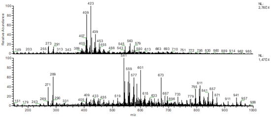 The positive mass spectrum of Manilkara huberi (Figure 4) displayed major ions at m/z 409 and 423 [M + H − H2O]+, which are consistent with dehydration products of alcoholic pentacyclic triterpenes, such as amyrin and its derivatives []. In contrast, the negative mass spectrum (Figure 4) showed several ions between m/z 500–1000, which could be attributed to the presence of tannins []. Additionally, in the negative mode, an intense ion at m/z 289 [M − H]− was observed, which is consistent with the structure of catechin based on a comparison of MS/MS data (Figure 5) with reference []. Thus, these findings suggest that Manilkara huberi wood contains both triterpenoid and polyphenolic compounds.