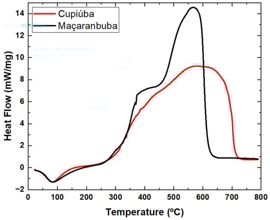 DSC curves of cupiúba (Goupia glabra) and maçaranduba (Manilkara huberi) a heating rate of 20 °C/min at argon atmosphere.