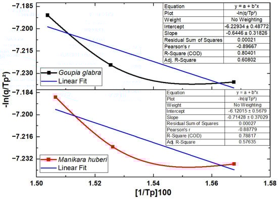 It can be noted that, as the heat flux increases, the alpha coefficient (α) decreases, which may lead to inaccuracies in the activation energy values due to the slope of the corresponding curve. Considering the fact that these are wood samples with similar structural molecules, significant variation in activation energy should not be expected, given the similarity in their molecular compositions [,,]. A comparative study was also conducted using the activation energy, where the decomposition parameter was employed. The mass change was derived as a function of time, with values approximating the maximum peak observed []. Graphs using the linear fit of the three heat flux variations as a function of 1/Tp with −ln(q/Tp²) were generated, as illustrated in Figure 11. The activation energy was derived from the linear coefficient of the equation.
