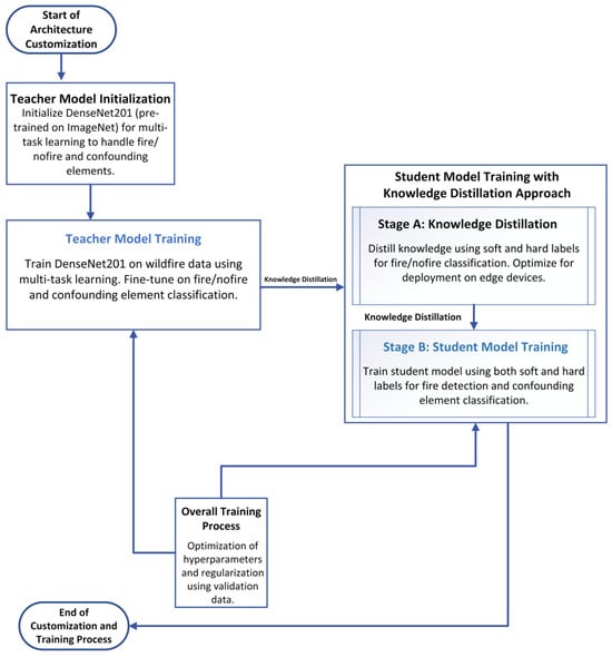 A multi-task learning approach was implemented to train the DenseNet201 teacher model, enabling it to optimize both the primary binary classification task (fire vs. non-fire) and an auxiliary multi-class classification task, which categorizes images into five subclasses, based on confounding elements. These subclasses are directly related to the primary task classes, further refining the model’s ability to distinguish between the fire and non-fire images. This strategy leverages shared features across tasks, enhancing the model’s generalization and robustness by allowing it to learn from the broader context provided by the auxiliary task.