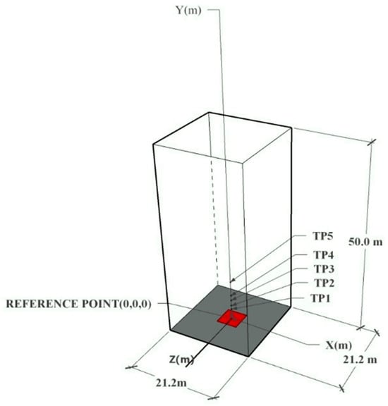 The setting in which the pool fire takes place is described by a square computational domain of an equal length and width of 21.2 m and a height of 50 m, similar to the study of Rengel, Mata []. As shown in Figure 1, a rectangular pool fire of a 60 MW intensity is positioned at the center of the computational domain. The pool fire area is 36 m2 with a HRRPUA (Heat Release Rate Per Unit Area) of 1.6 MW/m2, and it is located on the ground floor. The smoke yield defines the ratio of the produced smoke mass divided by the burned fuel mass (kg smoke/kg fuel), and for crude oil this is 12.5% []. The fuel used is referred to as heptane with a typical composition of C7H16 and combustion products of 0.037 kg/s soot. According to Gong, Ding [], for numerical simulations heptane could be surrogate for diesel. The conditions of the simulation are atmospheric, with a pressure of 101 kPa and temperature of 293 K. The wind orientation is applied streamwise at 0° with a speed of 1.1 m/s.