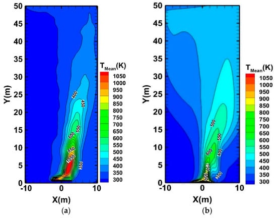 Contours of mean temperature fields at the symmetry plane (Z = 0) with (a) FDS and (b) FireFoam computational codes.