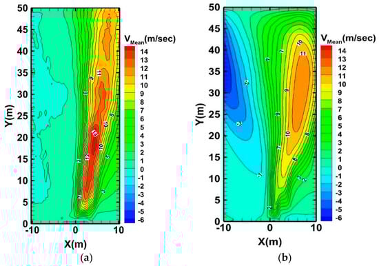 Contours of vertical mean velocity at the symmetry plane (Z = 0) with (a) FDS and (b) FireFoam codes.