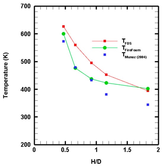 The numerical computer simulations of the isolated pool fire match both the geometry and the initial and boundary conditions of the experiments conducted by Munoz, Arnaldos [] and Rengel, Mata []. The experimental temperature data along the vertical axis of the plume correspond to the mean values at five dimensionless vertical positions above the pool center. These data, obtained using thermocouples, are shown in Table 1. A comparison of these measurements against the numerical simulations of FDS and FireFoam shows the following: (a) There is a very good agreement between the experiments and the FireFoam results, up to a dimensionless height of H/D = 1, which covers the region of the diffusion flame. At greater heights, there is a deviation of almost 50 K. The FDS results show a vertical displacement with respect to the experiments. (b) This behavior will be explained based on the contour plots shown below. The evaluation of the numerical results takes into account the quantification method by Ma and Quintiere []. The temperature differences between the numerical results and the experimental data for FDS and FireFoam, respectively, are as follows: a positive deviation of 8% and 4.0% at a dimensionless flame height of 0.473, and a higher deviation of 13% and 15% at a dimensionless flame height of 1.83. These last differences are explained in the discussion of the contour plots of the flame temperature.