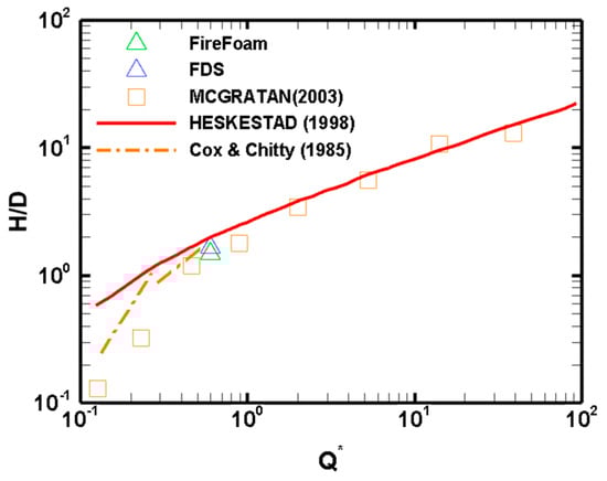 Figure 5 shows the predicted dimensionless flame height (H/D) for different dimensionless Heat Release Rates (HRR) in comparison with the experimental data of McGrattan, Floyd [] and the correlation equation of Heskestad []. Both the FDS and FireFoam codes predict the flame height at the flame symmetry plane (Z = 0), with a deviation of 6.5% and 15% below the Heskestad correlation curve, respectively. It should be noted that the experimental data from McGrattan, Floyd [] correspond to a square burner (with a side 0.3 m) over a large range of HRR values from 7 to 1800 kW. The flame heights corresponding to the lower HRR values do not align well with the Heskestad correlation. However, the lower HRR values show good agreement with the Cox and Chitty [] curve. Based on the latter correlation, the numerical results are within 1% for FDS and within 5% for FireFoam.