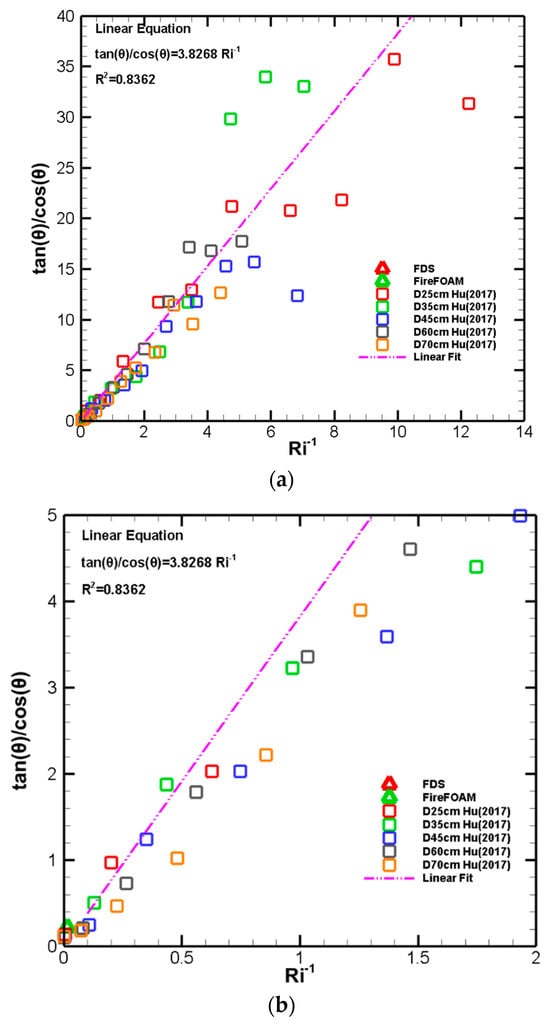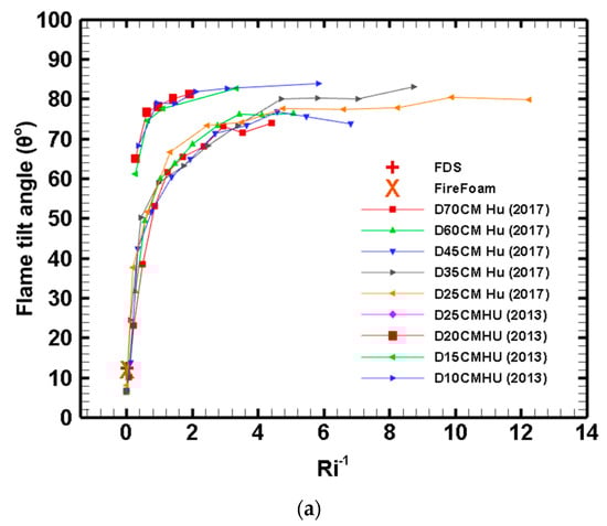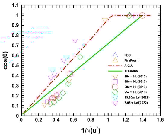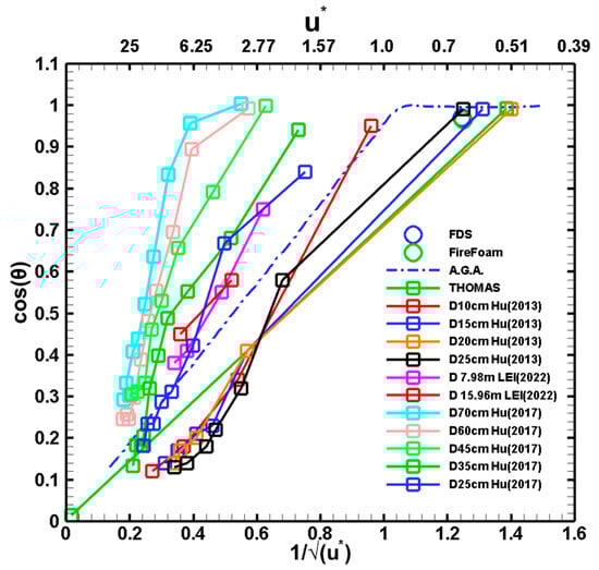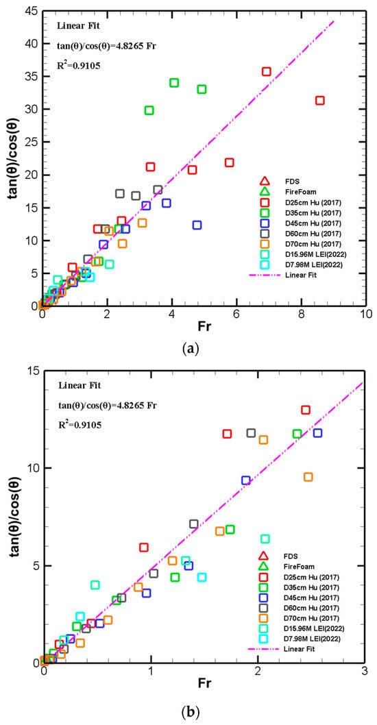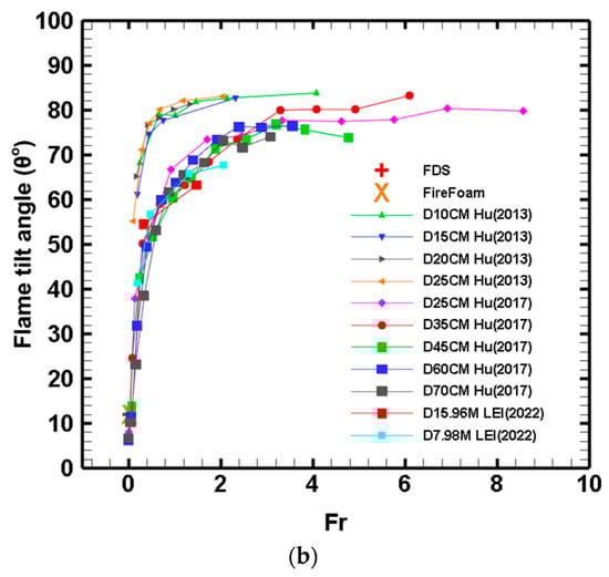 In Equation (17), , the term in parentheses approaches a constant value due to the high temperatures of the flame gas and is not sensitive to gas temperature, as per Jiang and Lu []. Then, it is also expected that the data in Figure 14a will scale with the Froude number. Figure 14b shows that this is the case. In this specific figure, the plotted data are from Lei and Deng [,] for very large pool fires, as well as all the data from Figure 14a. All of these data collapse, similarly to what is shown in Figure 14a. Based on these results, it becomes clear that the flame tilt angle scales well with both the and the numbers.
