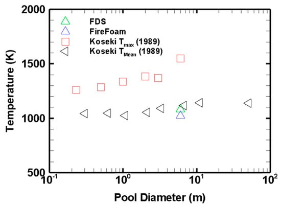 Figure 7 shows the numerical results of the present study against the experimental data of Koseki and Hayasaka [] for heptane pool fires of different pool diameters. The mean flame temperature of the present study agrees very well with these experiments. From a physical perspective, the figure also presents the maximum temperatures encountered experimentally. The numerical results for the mean temperature have a negative deviation from the experimental results of 3% and 6% for the FDS and FireFoam, respectively.