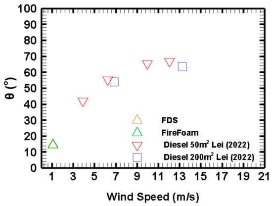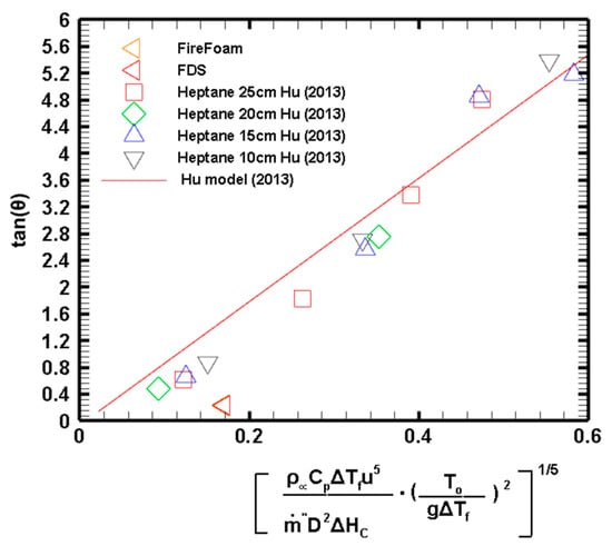One of the most recent models for the flame tilt angle proposed is that by Hu, Liu []. This dimensionless parameter equates wind speed to a characteristic velocity of the rising flame. This model incorporates the flame burning rate, which changes with the inertia force of wind speed.