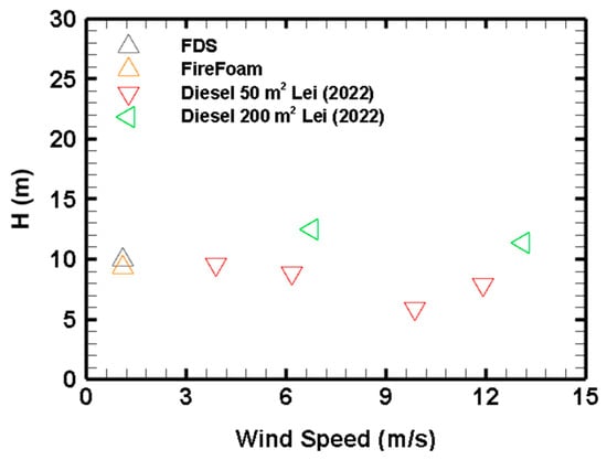 In Figure 6, the flame tilt angles of pool fires under cross air flow from the present study are compared against the experimental datasets of Hu, Liu [] for small pool fires, the experimental data of Lei, Deng [], Lei, Deng [] for very large pool fires (50 m2 in the range of wind speeds 3.8–12.7 m/s and 200 m2 in the range of wind speeds of 7.2–15.2 m/s), and the correlation equations of A.G.A. and Thomas. The numerical results are in good agreement with the A.G.A. model. The tilt angle of the present study is 12 deg, which is close to that of 15 deg for this range of velocities, according to Munoz, Arnaldos [].
