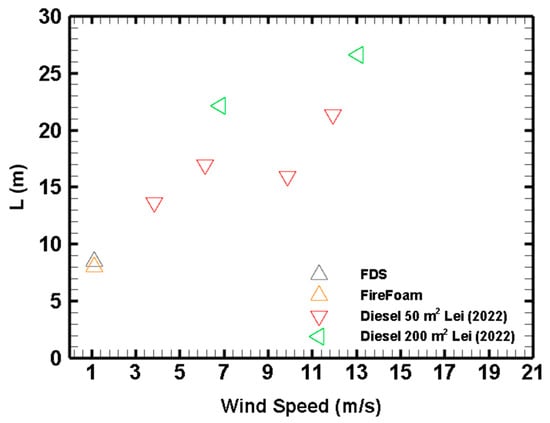 where is the flame drag coefficient and is the ratio of the densities of the fuel at the source and the ambient surrounding air. Fang [] showed that his experimental results for three different fuel types were well correlated with his model against the Froude number, with 1.54 as the value of the proportionality constant.