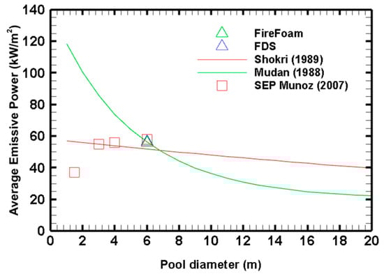 where σ is the Stephan–Boltzmann constant, which is equal to 5.67 (, TF is the flame temperature (K), Ta is the ambient temperature (K), and is the flame emissivity. The surface emissive power of hydrocarbon pool fires decreases due to unburned products such as soot. The average surface emissive power compared with the experimental data of Munoz, Planas [] is shown in Figure 12.