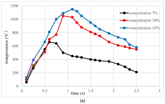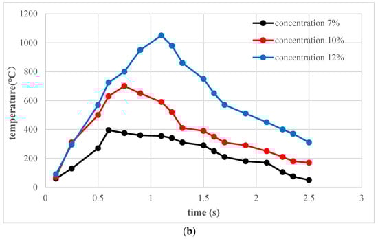 (a) The explosion temperature for different concentrations of methane under the action of pure water, and (b) the variation of the explosion temperature as a function of time for different concentrations of methane in the presence of 1% additive.