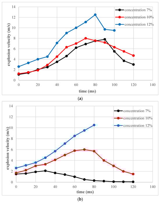 (a) The explosion velocity for different concentrations of methane as a function of time under the action of pure water, and (b) the explosion velocity for different concentrations of methane as a function of time under the application of 1% additive.