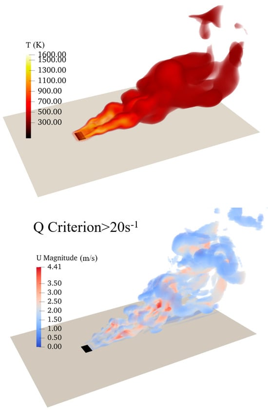 Figure 2 shows the transient temperature and Q-criterion contours for Uref = 0.5 m/s. This is a typical representation of the temperature distribution and vortex structure during fire burning. The maximum temperature for this condition is about 1600 K, which is lower than that of the no-wind condition. A high temperature is observed around the fire source, and the flame is significantly inclined in a downstream direction due to the combined effect of the slope and wind. Further downstream, the gas temperature is lower due to the expansion of the hot gas product and mixing with environmental fresh air. Two streaks with a higher temperature exist near the rear edge of the fire source, which can also be seen in the Q-criterion contour. Hairpin vortexes originate from the fire source due to jet and wind interaction and are then enhanced by the Kelvin–Helmholtz instability between the wind and fire flows. Iso-contours of a Q-criterion larger than 20 s−1 are shown with overlaid color by velocity magnitude, of which the maximum is around 4.41 m/s, much larger than the incoming velocity. The fire-induced velocity is more intense downstream and is weak near the fire source. As the fire products are advected downstream, it is also lifted higher due to buoyant force. A larger and higher hairpin vortex can be observed near the outlet, although with weaker vorticity (a smaller Q-criterion value).