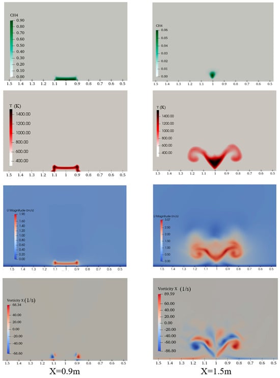 The CH4, temperature, velocity magnitude, and x component of vorticity distributions along spanwise cross-sections at two streamwise locations: X = 0.9 m and X = 1.5 m (looking in the x-positive direction).