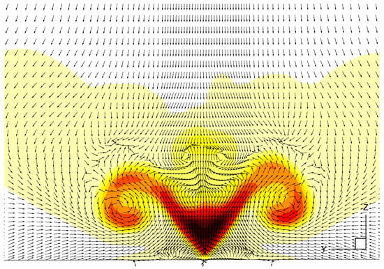 At X = 1.5 m, all the variables show significantly different distributions compared to 0.9 m. For the methane concentration, it looks like an upside-down triangle, with larger values at higher locations and lower values at two flanks. The methane here is advected from the fire source by the environmental and fire-induced winds and is consumed gradually until being burned out. Temperature shows a bird-like shape, with two large plumes at two sides, which is a consequence of the strong air entrainment in these places. The high temperature in the center region is contributed by two factors: one is local methane combustion, and the other is the convection of flame products from upstream. The velocity contour shows a similar distribution to temperature for the same reason above. It occupies a larger region outside and above the flame region due to the lag effect of velocity to the temperature of the buoyant flame. Vorticity x shows a stratified pattern on two sides of the flame. On the right side, three positive vorticity x regions and two negative vorticity x regions can be observed. The largest positive vorticity and bottom negative vorticity are caused by the air entrainment to the flame region near the slope, while the top positive vorticity and negative vorticity are due to air entrainment to the mid-height flame region. Figure 4 presents the detailed velocity vectors with background temperature distributions. It should be noted that there are tangential velocity vectors, which also have streamwise velocity components, and the flow direction is mainly downwards. It is evident that the two wings of the plume are extracted and stretched out from the center flame region by the air circulation. In the meantime, the high-temperature products in the center region will flow downstream and upwards, which will also induce air entrainment towards the center line. This air circulation will also carry the plume from the lower region to the center line, causing the negative vorticity between the top positive vortex and the largest positive vortex. It must be emphasized that the air entrainment and flame updraft are different at different locations.