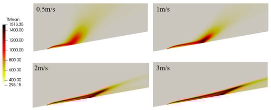 Wind speed has a significant effect on the temperature and velocity distributions. Figure 5 shows comparisons of time-averaged temperature distributions at the streamwise middle cross-section under different wind speeds, which are 0.5 m/s, 1 m/s, 2 m/s, and 3 m/s. The most distinct effect is that the flame is more elongated and inclined towards the surface under high velocities. When Uref = 0.5 m/s, the flame is almost parallel to the surface at immediate locations behind the fire source but starts to rise upward further downstream, which means that the buoyant force and inertial force are comparable under this velocity. When the velocity increases to 1 m/s, the inertial force is stronger and the downstream flame is pushed closer to the surface. The temperature is higher near the flame attachment point. The flame tail is almost parallel to the slope for higher velocities (2 m/s and 3 m/s). Due to this, the unburned fuel in this region will experience a higher heating rate from convective heat transfer and radiative heat transfer.