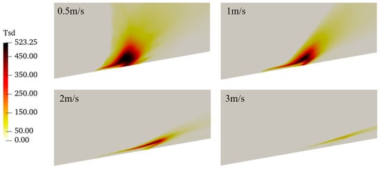 Figure 6 shows the time-averaged temperature fluctuations at the streamwise middle cross-section under different wind speeds. It can be seen that the temperature fluctuations have different distributions to the temperature. Contrary to the temperature, temperature fluctuations decrease with the wind speed. For Uref = 0.5 m/s, the maximum fluctuation is about 523 K, which is about 33% of the temperature. The fluctuation is largest around the location where the flame rises and decreases with height. When the wind speed increases, not only does the temperature fluctuation value become smaller but the region with obvious fluctuations also become smaller. Similarly to the temperature, the fluctuation shape tends to become parallel to the slope under higher velocity. For all the velocity cases, the temperature fluctuations mainly occur near the flame tip, as in Figure 5. For the flame near the fire source, fluctuation is not obvious. This is mainly because the high temperature is quickly advected by the wind. It should be noted that turbulent fluctuations are not imposed on the incoming wind, and this affects the flame dynamics, which we will leave for future investigations.