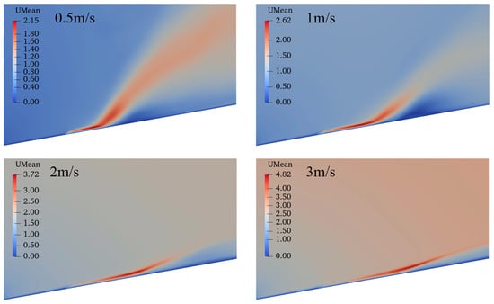 Effect of wind speed on the time-averaged velocity magnitude at the streamwise middle cross-section.