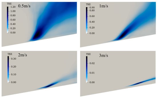 Figure 8 shows the turbulent kinetic energy (TKE) for four wind speeds. Its variation with wind speed is similar to the temperature functions. This is expected, since velocity change is most likely happening around the locations where the temperature changes significantly. The TKE also decreases with the wind speed, from 1.2 m2/s2 to 0.9 m2/s2, 0.34 m2/s2, and 0.028 m2/s2. This means that the TKE is smaller for the fire-induced wind, as no turbulent fluctuations are considered for the incoming flow. The TKE is mainly caused by the buoyant-force-induced velocity change. When the buoyant force is dominated (as in 0.5 m/s), the updraft and horizontal flow are both intense in the presence of strong air circulation. When the inertial force is dominated (as in 3 m/s), the upward flow of the high-temperature gas will immediately be blown downwards, suppressing the spanwise air entrainment in the vertical direction. If incoming turbulence is considered, then the TKE field may be different, and this requires further systematic investigation.