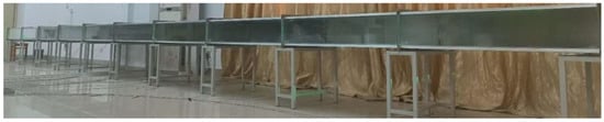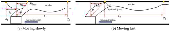 Figure 5a. However, when the moving speed of the fire source increases to a certain degree, the hot smoke mainly spreads to the front side behind the fire source, and the smoke spreading to the front of the tunnel disappears. At the same time, the smoke layer changes in stability, the smoke plume bifurcates in the process of rising, and a more obvious water jump phenomenon is formed, as shown in