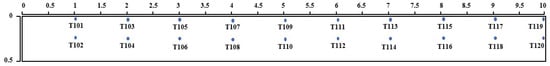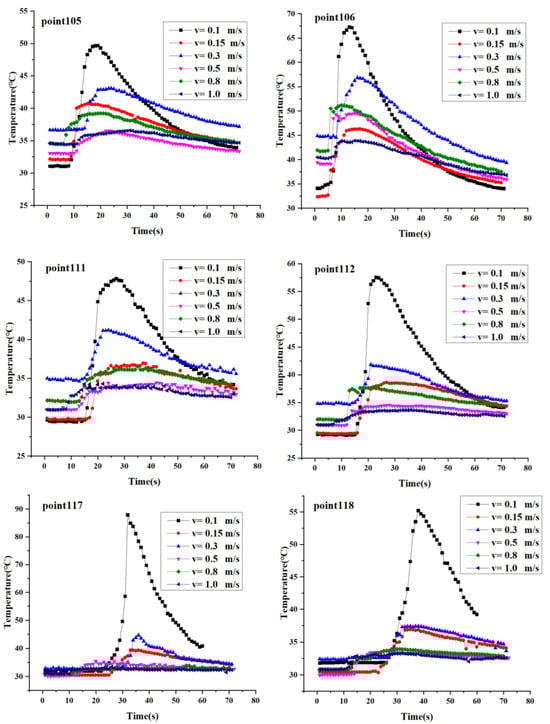 The flue gas flow inside the tunnel is complex and is influenced by a variety of factors, among which the variation of the ceiling temperature has a significant relationship with the flue gas flow pattern. The distribution of ceiling temperature not only reflects the thermal characteristics of the flue gas but also directly relates to the stability of the flue gas layer and the rate of flue gas spreading. To comprehensively analyze temperature changes in the tunnel, temperature sensors at points 105, 106, 111, 112, 117, and 118. They are positioned at the front, middle, and rear sections of the tunnel, as shown in
