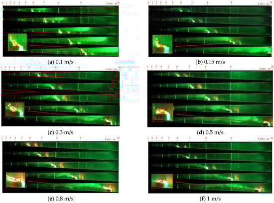 Figure 4 illustrates the smoke dispersion process at varying fire source speeds of 0.1 m/s, 0.15 m/s, 0.3 m/s, 0.5 m/s, 0.8 m/s, and 1.0 m/s.