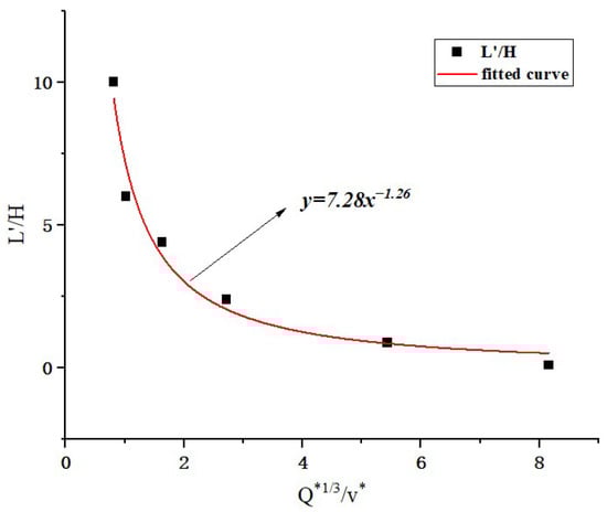 Figure 6 shows the relationship between the water jump distance and the dimensionless ignition source power and ignition source shift velocity for different operating conditions. Based on the fitting results, Equation (3) can be derived for the relationship between the length of the smokeless zone, the heat release rate of the dimensionless ignition source, and the shift velocity of the dimensionless ignition source: