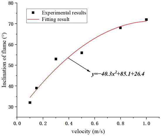 Figure 7 delineates the relationship between flame inclination and various speeds of the moving fire source. Notably, the inclination in the flame heightens with an increase in the fire source’s velocity, and it is particularly pronounced when the speed escalates from 0.1 m/s to 0.5 m/s. This trend underscores a two-fold effect at speeds below 0.5 m/s: first, the motion of the fire source enhances its interaction with ambient air. The vapors are produced to mix with fresh air, thereby hastening combustion. Second, this movement induces a pronounced piston wind effect, drawing a significant flow of air from the fire source’s front to its rear and consequently increasing flame inclination because of the wind’s pull; however, as the fire source moves at a speed greater than 0.5 m/s, the increase in flame inclination is relatively slow, and strong piston winds are generated in the tunnel. The strong air disturbance makes it difficult for fuel vapor to accumulate in the combustion area. Heat dissipation from the fire source is accelerated, and a large amount of heat from the fuel reaction is taken away, thus weakening the combustion reaction of the fuel and inhibiting the combustion of the fire source.
