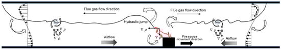 Figure 8. The red line represents the outline of the flame and the black line represents the outline of the smoke spread. For the fire plume, the center flow velocity is larger, and the flow velocity at two sides is smaller. The smoke shows a water jump phenomenon. At the same time, under the influence of the velocity gradient, a certain size of the vortex will be produced. As the fire source moves, the tail of the fire source forms a negative pressure zone. Pressure above the fire source is larger, and the gradient of the pressure is vertically downward; the air around the fire source is densely packed, and the gradient of the density is horizontally outward; vortex volume is formed because of inconsistencies in the direction. When the fire source moves at a low speed, the fluid microgroups rotate clockwise at the junction of hot smoke and cold air on the right side of the fire source and rotate counterclockwise on the left side of the fire source. As a result, the fire plume flows to the left and right sides of the fire source bifurcation when there is a fire source moving in the same direction as the smoke and airflow; however, with the moving speed of the fire source increasing, the piston wind speed in the tunnel augments accordingly. It leads to strengthened velocity shear between the cold air and the hot smoke layer and also an increase in the vortex at the interface between the hot smoke and the cold air. Due to the increase in vorticity, the strength of air entrainment augments, which gradually destabilizes the smoke layer. The fluid micro-cluster on the left side of the fire source rotates counterclockwise, and smoke flows, and the fire source moves in the opposite direction.