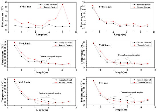 18]. Building upon this finding, the present study undertakes a comparative analysis between the temperature at the tunnel’s central detection point and that along the tunnel wall, aiming to elucidate variations within the tunnel ceiling’s temperature field. It is observed that temperatures tend to be significantly higher in the front section of the tunnel compared with those in the middle and rear sections. Moreover, it was discovered that the temperature of the tunnel’s ceiling varies in tandem with the fire source’s moving speed, indicating that the temperature changes are directly influenced by the fire source’s velocity. With an increase in the moving speed of the fire source, the temperature of the tunnel ceiling will be changed. A central low-temperature area will gradually appear.