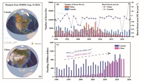 (a) Hotspots at Canada and China observed by MODIS (16 August 2023). The image was downloaded from Fire Information for Resource Management System. (b) The annual number of forest fire and burned area in Canada and China over the year of 1990~2023. (c) Variation trend of total funding for forest fire prevention and suppression in Canada and China over the period from 1990 to 2018.