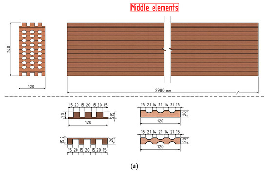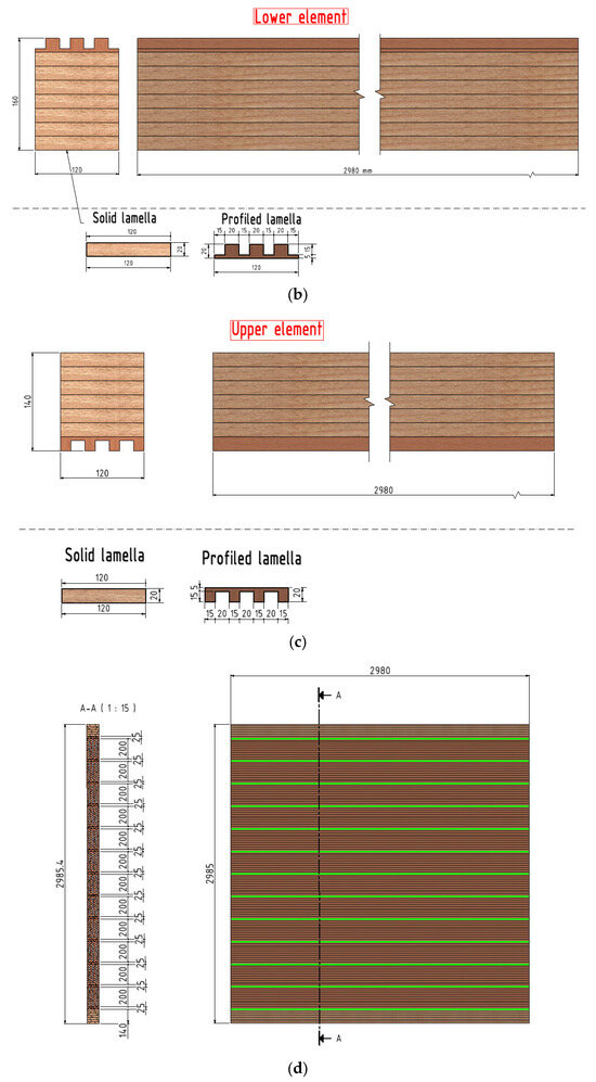 Finally, the dimensions of the load-bearing wall are 2980 mm × 2985 mm × 120 mm (width × height × thickness). The pattern of the load-bearing wall made of hollow, laminated timber elements consists of a total of 14 interconnected elements: beams. The upper and lower elements are solid and have flat surfaces on the outside, which rest on the supporting structure of the vertical stove. Between them are 12 hollow elements with a profile on the top and bottom that allows them to be joined together. The connections between the elements are made without additional fasteners. The unit element of the load-bearing wall consists of a total of twelve lamellas glued together. The slats are made of softwood (fir) with a thickness of 20 mm and are manufactured in such a way that the fibers inside the wood run in the direction of the length of the beam. Three grooves in the shape of a half ellipse with a width of 21 mm and a depth of 7 mm are made along the entire length of each lamella. The grooves are made on both sides of the lamellas, and by joining them together, holes (ellipses) are obtained along the beam measuring 21 × 14 mm (half ellipse axes). The lamellas were glued with K. 510 adhesive [34]. On the top side of the element, a profile of three rectangles measuring 20 × 15 mm was made at a distance of 15 mm. On the underside of the beam there is a profile consisting of four rectangles measuring 15 × 15 mm, which were placed 20 mm apart. In this way, the individual glulam elements can be wedged together.