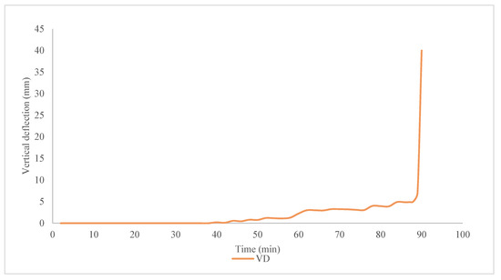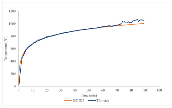 The ambient temperature in the laboratory was 24.6 °C, while the relative humidity was 58%. The furnace allows for the standard exposure of test specimens to fire in terms of thermal load and pressure. The fire in the furnace’s fire chamber is generated by six burners with liquid fuel (fuel oil) in accordance with the HRN EN 1363-1:2020 standard, points 4.1 and 4.2 [37]. The air temperature in the test area was kept at a temperature of 20 (±5) °C for 24 h before the fire test. The heating in the furnace is determined using the standard temperature curve according to HRN EN 1363-1:2020, point 5.1, and is shown in Figure 3.