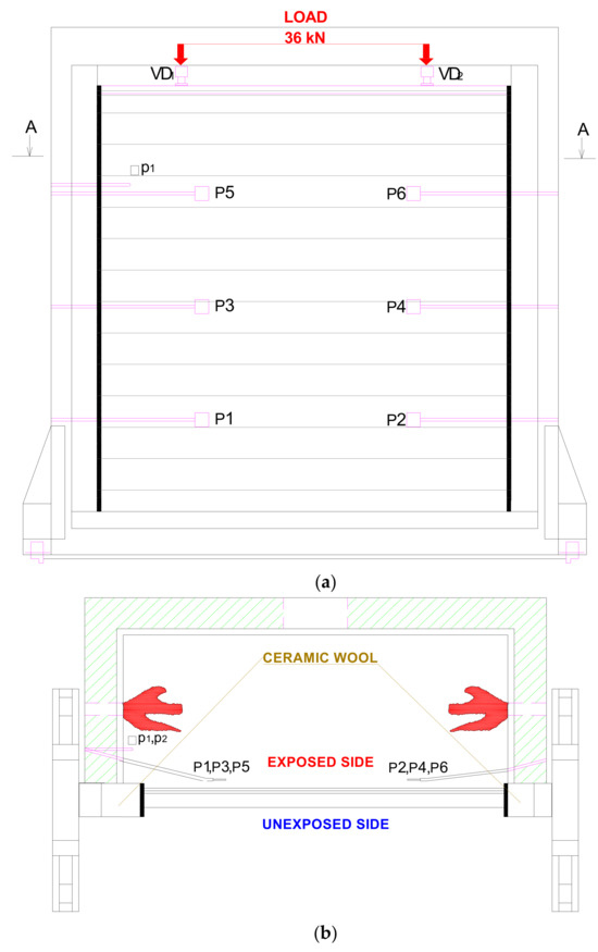 A large-scale fire test was carried out on a protected load-bearing wall made of hollow elements. This system can be regarded as a small, illustrative “mock-up” of the fire compartment in which the dynamics of the fire were investigated. The load-bearing wall was protected by fire protection cladding. The test was carried out in accordance with the standards HRN EN 1363-1:2020, “Fire resistance testing—Part 1: General requirements” [37], and HRN EN 1365-1:2012+Corr.1:2013, “Fire resistance testing of load-bearing elements—Part 1: The walls” [36].