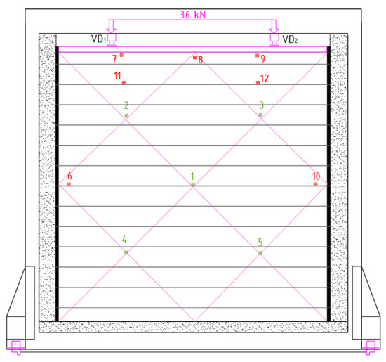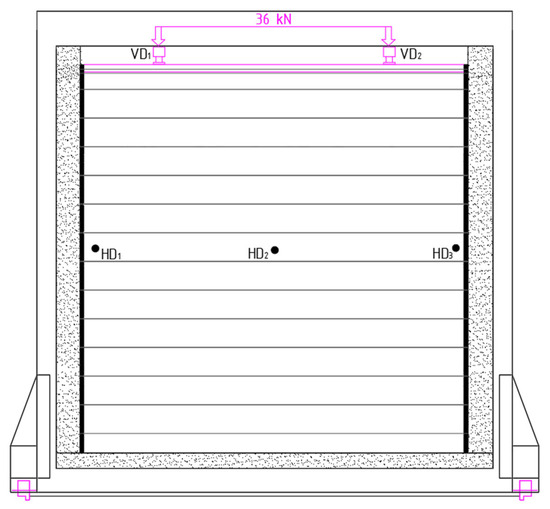 During the test, the horizontal deformations were measured at three points and the vertical deformations were measured at two points. The horizontal deformations were measured at points HD1 and HD3—in the middle of the height of the sample, 50 mm from the free edge and at point HD2—in the middle of the sample. When measuring the vertical deformation, the measuring points VD1 and VD2—along the free ends of the specimen—are the vertical displacement of the horizontal beam for distributing the load of the specimen. The specified measuring points are shown in Figure 7.