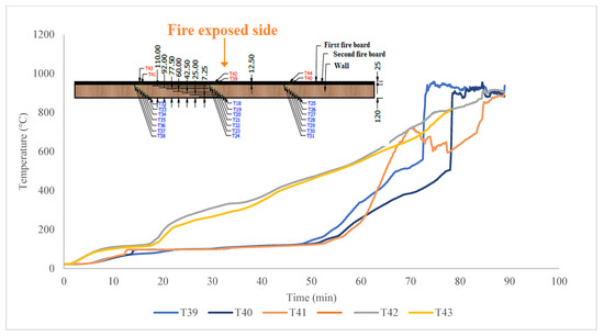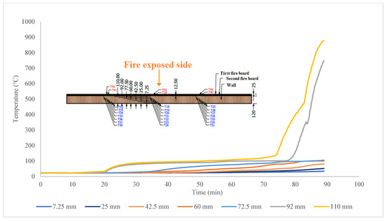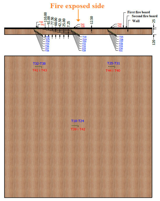 Regarding the temperature in the sample, the temperature on the non-exposed side of the sample was measured with 12 NiCr-Ni thermocouples (type K), with wire Ø 0.5 mm, welded on copper disks Ø 12 mm and a thickness of 0.2 mm, in accordance with HRN EN 1363-1:2020, point 4.5.1.2. The thermocouples were covered with inorganic insulating material measuring 30 × 30 × 2 mm and were attached to the measuring points with inorganic adhesive. The measurement of the average temperature rise, and the measurement of the maximum temperature rise of the non-exposed side of the sample, was recorded with thermocouples attached at positions in accordance with the standard HRN EN 1365-1:2012 [36], point 9.1.2. Additional thermocouples were placed inside the structure as follows: