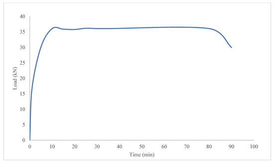The specimen was loaded with a permanent load of 12 kN/m, which corresponds to a total permanent load of 36 kN applied to the specimen. The load was achieved using a hydraulic system that acted uniformly on the horizontal beam to distribute the load. A continuous load was applied to the specimen in the central axis over the entire width of the cross-section of the load-bearing wall. The loading conditions correspond to the example (d) shown in Figure 1 of the standard HRN EN 1365-1:2012 [36], in which the load transfer system is shown, and the load is applied from the top of the test specimen. The sample was loaded incrementally before the start of the test. The required load of 36 kN was reached 20 min before the start and maintained throughout the test (Figure 8).