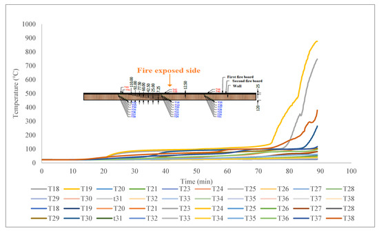 The charring stages of the tested wall are shown in Figure 19. After removal of the fireproofing, the charring rate (β0, phase 3 = 1.3 mm/min) increases above the value given in EC5 (β0 = 0.65 mm/min), by a factor of two (k3 = 2) up to the moment ta, which represents the moment at which the charring depth is equal to the charring depth of the same element without fireproofing or 25 mm (the smaller of the two values). From this moment onwards, the charring rate returns to the value given in EC5.