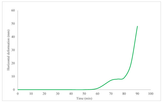 “Phase 0” means the phase without charring, i.e., the fire protection cladding completely protects the wall. During this initial stage, the wood is subjected to elevated temperatures yet has not attained the requisite thermal conditions for the initiation of charring (see Figure 9). As evidenced by the results (Figure 9 and Figure 10), the temperature during this phase did not surpass 150 °C. Upon exposure to increasing temperatures, the wood’s primary reaction was the evaporation of moisture, particularly the free water present within the wood (water that resides in the intercellular spaces). Phase 0 was predominantly focused on the desiccation of the timber rather than its degradation. The absorbed thermal energy facilitates the transformation of liquid water into vapor, which temporarily mitigates the increase in temperature within the wood itself. As the wood underwent heating, it experienced expansion and deformation (refer to Figure 12) attributable to thermal expansion. This process resulted in minor alterations in form or the occurrence of fissures. In Phase 0, there was an absence of deterioration in the structural integrity or mechanical properties of the wood. As depicted in the results (Figure 11), during the concluding moments of Phase 0, thermal energy began to infiltrate the superficial layers of the wood, establishing a thermal gradient extending from the exterior to the interior. While the surface temperature escalated, the core remained cooler due to the insulating characteristics inherent to wood (Figure 10). Given that no chemical decomposition has commenced, the wood retained its chemical integrity. Phase 0 holds substantial significance as it delineates the wood’s preliminary response to exposure to fire, and extending this phase can effectively defer the commencement of charring. By comprehensively understanding and exploiting the attributes of Phase 0—such as through moisture management, protective strategies or the application of fire retardants—designers can enhance the overall fire resistance of timber structures.