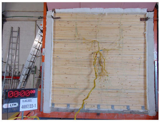 The test was performed on one, symmetrical sample. The sample was exposed to fire from the side where the gypsum–fiber boards were placed [35]. The specimen was installed in the frame of the test furnace with a light opening of 3020 × 3050 mm (height × width), which is suitable for testing load-bearing structural elements, and which was carried out in accordance with Figure 1 of the HRN EN 1365-1:2012 standard [36]. The specimen is fixed at 7 points via a steel bracket to the lower horizontal part of the frame of the test furnace made of reinforced concrete with a density of approximately 1600 kg/m3. The sample was only fixed in the lower horizontal part. The vertical ends of the sample were left free. The space between the vertical ends of the sample and the frame of the test furnace is filled with ceramic wool and represents the free ends of the sample. The sample was assembled in such a way that the lower part of the test frame was attached to the lower solid plywood element in the manner described above. Perforated elements are then stacked on top of this, which are joined together, with 12 in total. The upper solid element was placed on the perforated elements towards the upper part of the test frame and a steel beam was lowered onto it for loading.